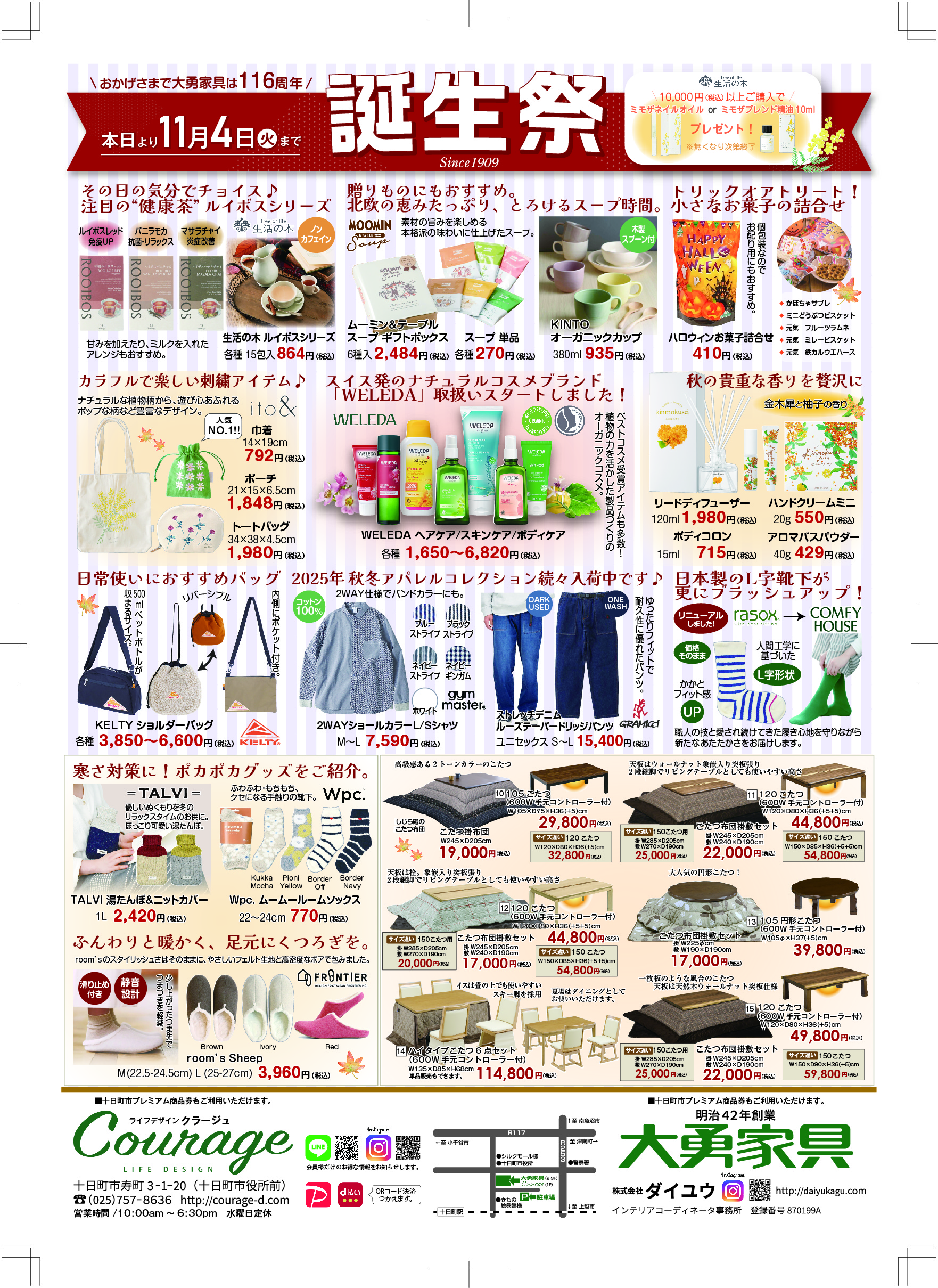 秋の雑貨や新作のコタツが載っているチラシをアップしましたので、ご覧下さい。